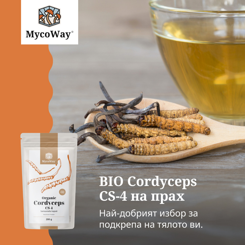 Съставки: 100% прах от мицел на Cordyceps CS-4 (Samsoniella hepiali). От сертифицирано биологично производство. Дистрибуция под надзора на SI-EKO-002. Земеделие извън ЕС.